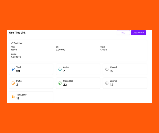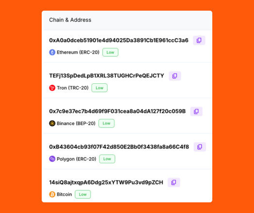 Every client and every order automatically gets its own unique deposit address. When money arrives, your dashboard instantly shows who paid and for which invoice. No more guessing or manual matching.